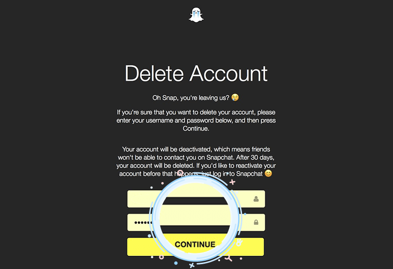 Visit Snapchat’s online support site. Choose the “Delete Snapchat” link, and login.