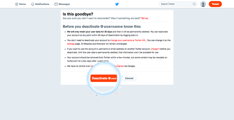 Enter your password and select the deactivation button. You have 30 days from this point to sign back in and keep your Twitter account, or else your account is lost forever.